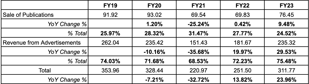 The bulk of the company’s revenues come from 1) The sale of publications, and 2) Revenues from advertisements. Advertising revenues generally accounts for between 70-75% of total revenues, with sale of publications accounting for the remaining 25-30%.